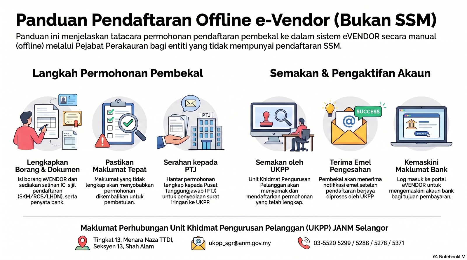 Pihak JANM Selangor hanya akan memproses borang pendaftaran yang dikemukakan oleh PTJ bagi memastikan kelancaran urusan dan mengelakkan sebarang aduan. Untuk makluman, pendaftaran ini dikhususkan bagi pembekal yang tidak berdaftar dengan SSM, seperti entiti di bawah ROS (pertubuhan), JAKIM (masjid), SKM (koperasi), ROB (bagi Sabah/Sawarak) serta organisasi seumpamanya.
